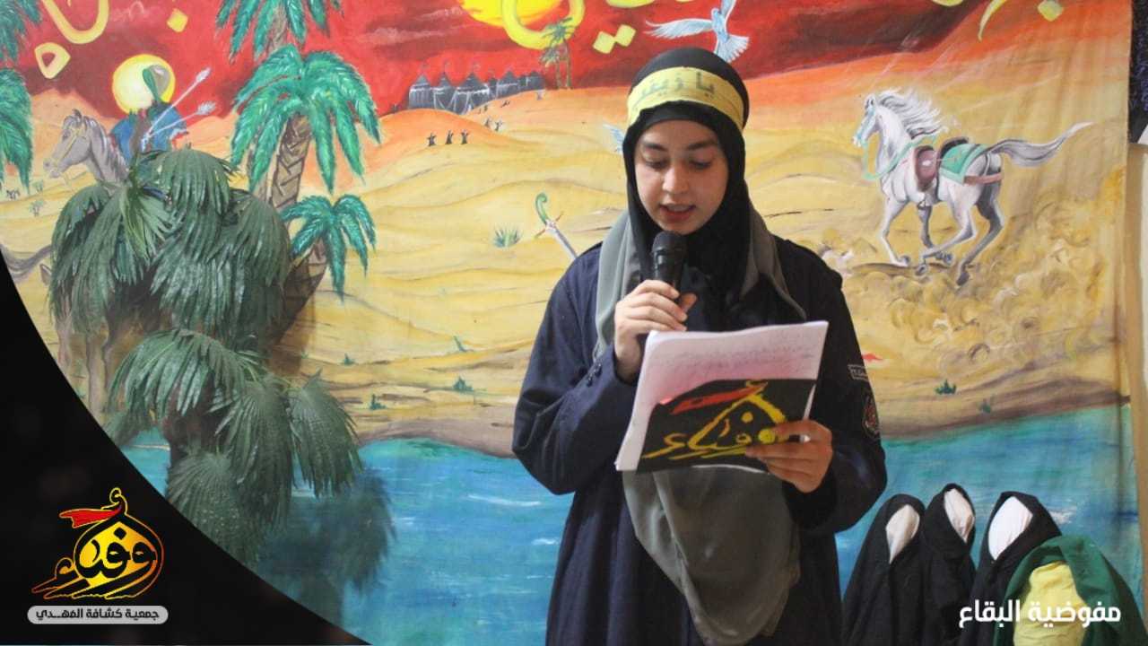 وعادت عاشوراء محملة بعبق الشهادة وعطر الحسين ، فاجتمعت كشفيات فوج السيدة الزهراء/ طاريا/ القطاع الغربي وبحضور ١٣٥ زينبية ، وسافر الركب بهن نحو كربلاء مع تعظيم القرآن و مجلس عاشورائي ، وحط الرحال في المدينة عند فاطمة العليلة فكانت المسرحية و اختتم المجلس بزيارة الامام الحسين عليه السلام و دعاء الحجة عجل الله فرجه
