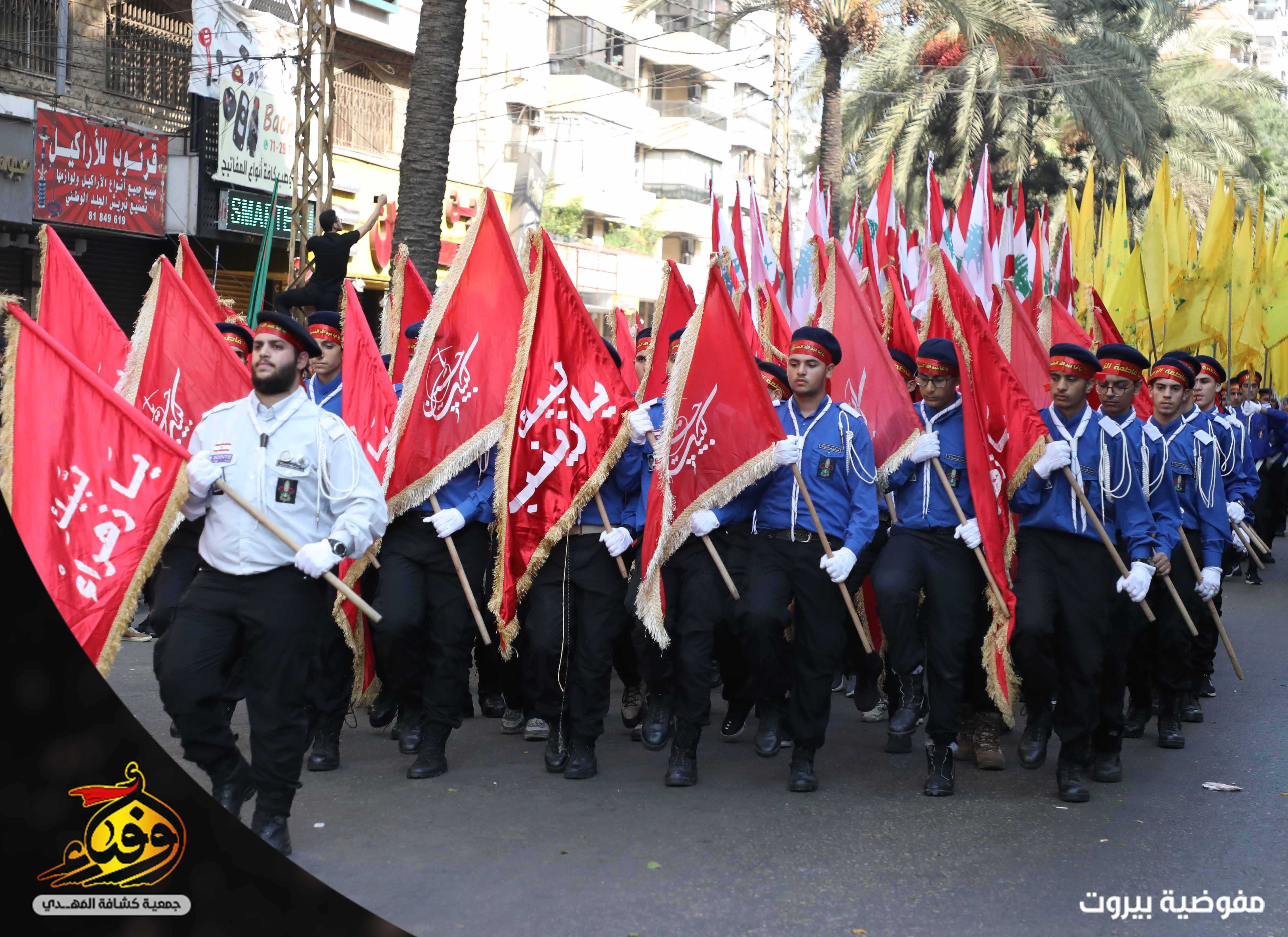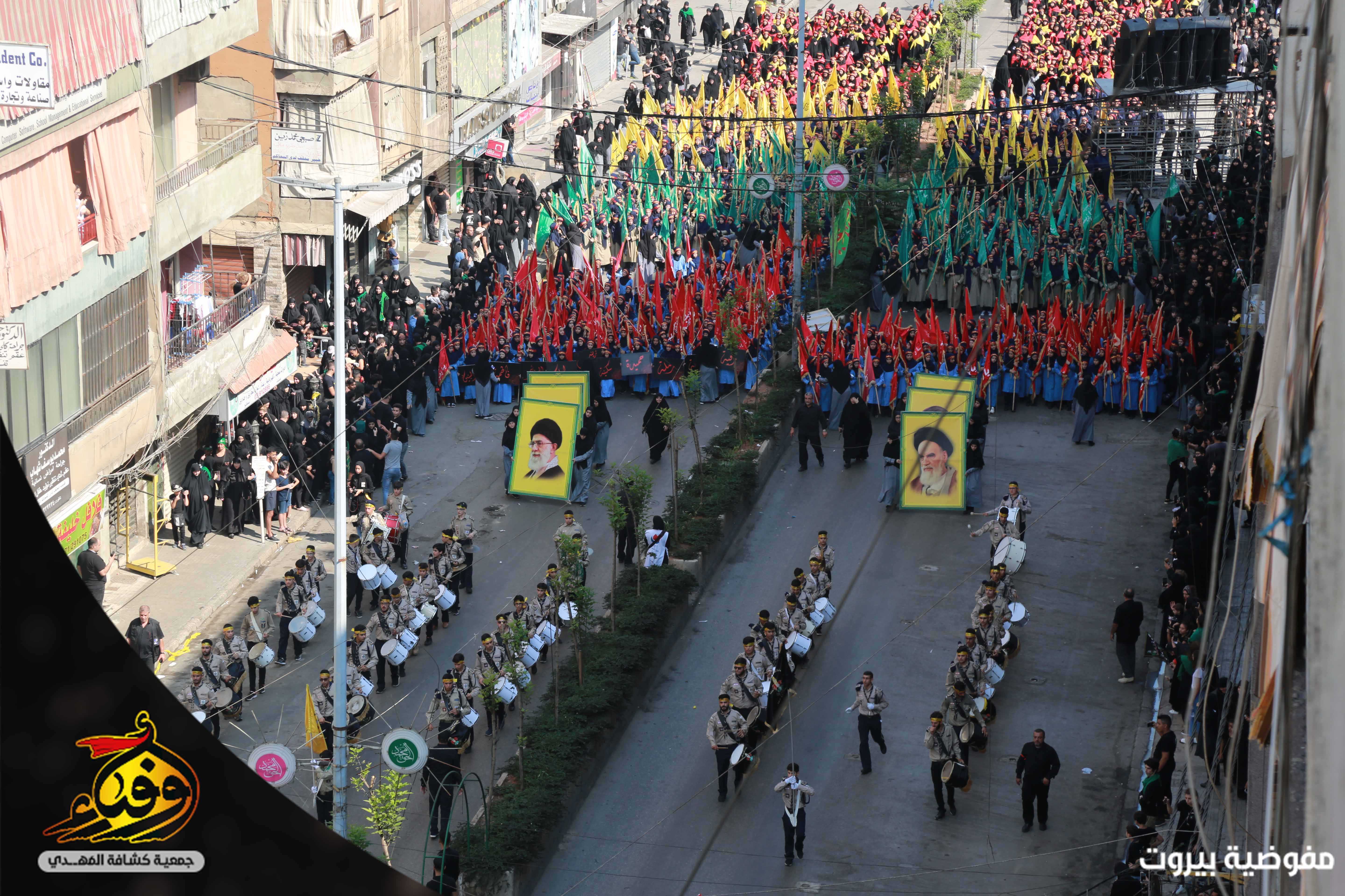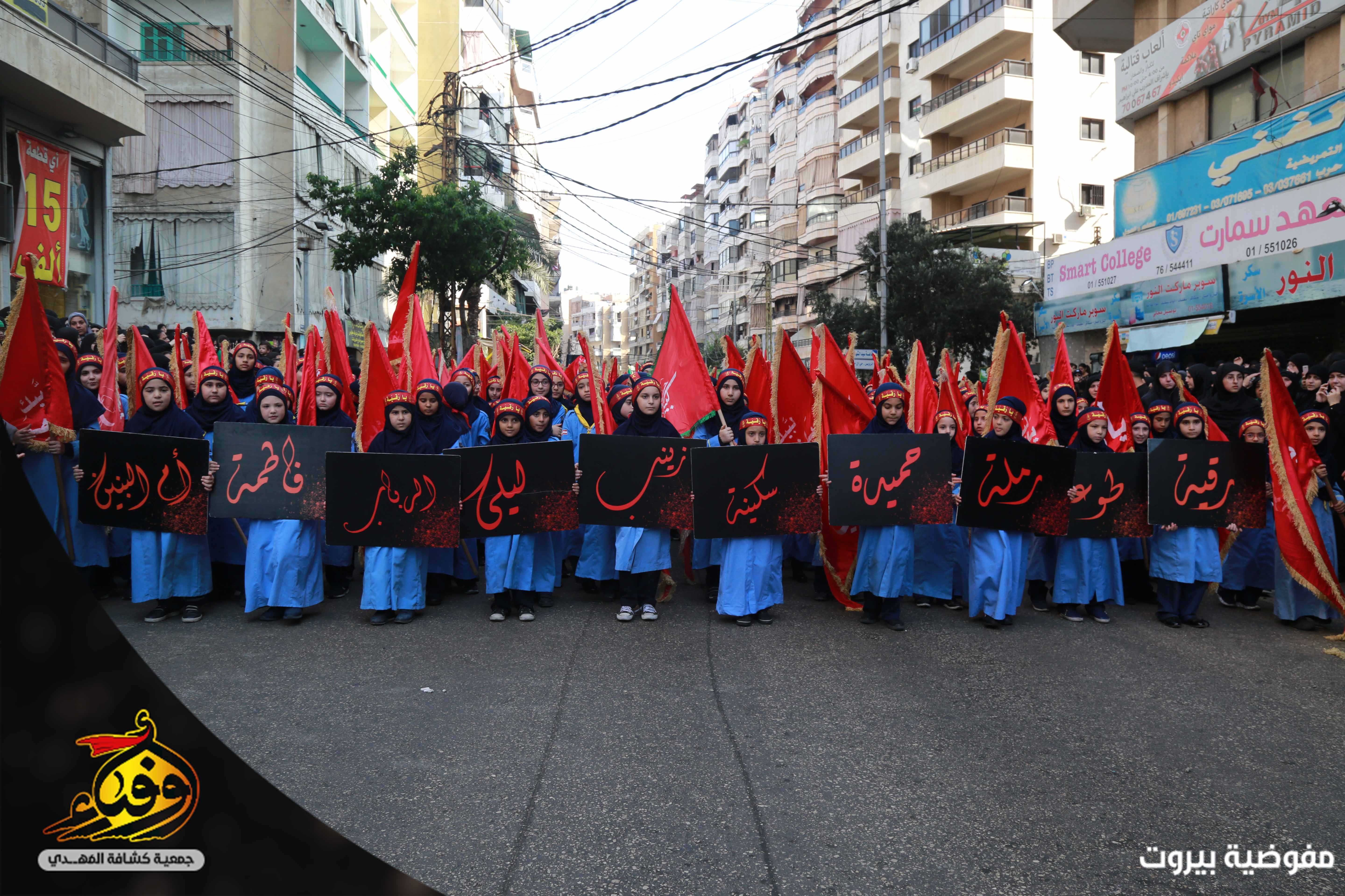 في مشهد مهيب بدأت مسيرة العاشر من محرّم يتقدمها 3793 حسيني وزينبيّة من مفوضية بيروت في جمعية كشافة المهدي (عج) حيث انطلقت مسيرة الاخوة من تقاطع القائم (عج) في الضاحية الجنوبية لبيروت باتجاه دوار الكفاءات تقدمها حملة صور القادة والفرقة الموسيقية المركزية وحظائر الاعلام وسريّة من القادة والجوالة مؤدين عرضا مميزا للنظام المرصوص تلتهم سرايا كوكبة الاعلام بالاضافة الى مواكب اللطم للكشافة.. اما مسيرة الاخوات انطلقت من الرويس باتجاه دوار الكفاءات تتقدمها الفتيات باللباس الكشفي حاملين الرايات و في موكب حاشد انتظمت الكشفيات مرتدين العباءة الزينبية لتختتم المسيرة بالاستماع لكلمة سماحة الامين العام حفظه الله.