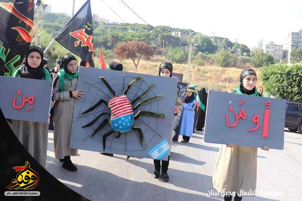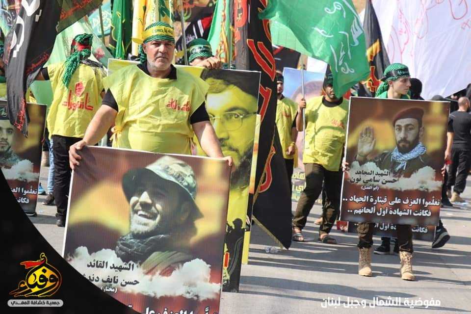 هتافات، شعارات وقبضات مرفوعة تلبية لنداء الامام الحسين عليه السلام، الصورة من قطاع المتن الشمالي تترجم ثورة الامام الحسين واقعة كربلاء، بحضور عضو المجلس التنفيذي في حزب الله الشيخ شوقي زعيتر.