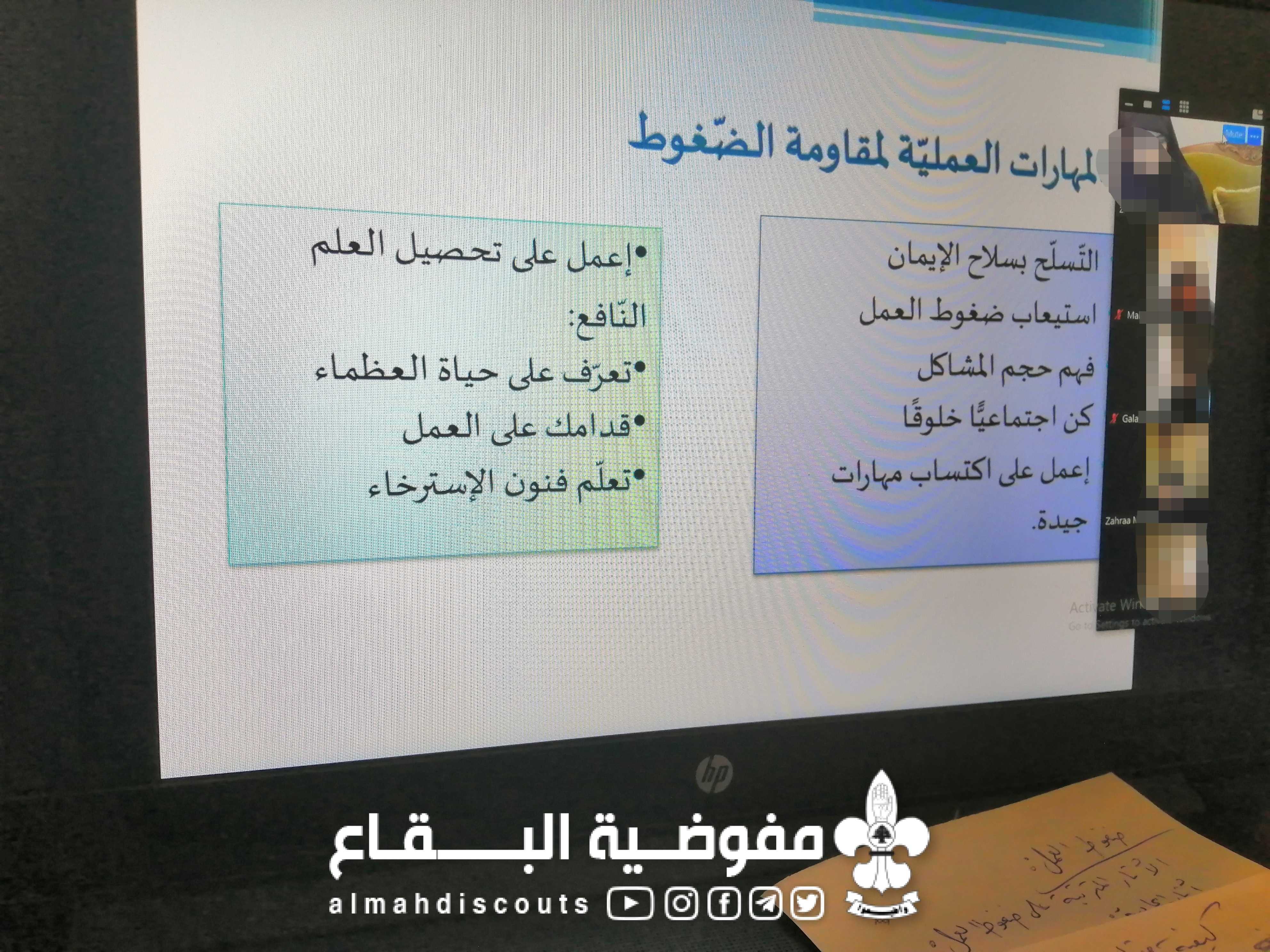 ضمن المسار التدريبي الرتبي المستوى الثالث "عضو قيادة مفوضية" نفذت أمانة التدريب في مفوضية مرشدات البقاع ورشة "كيف نسيطر على ضغوط العمل" قدمتها رئيسة جمعية مرشدات المهدي القائدة زينب غندور الكترونيا، وحضرتها مفوضة المنطقة، أمينات الاختصاص وأمينات المرشدات اللواتي ابدين تفاعل وحماس...