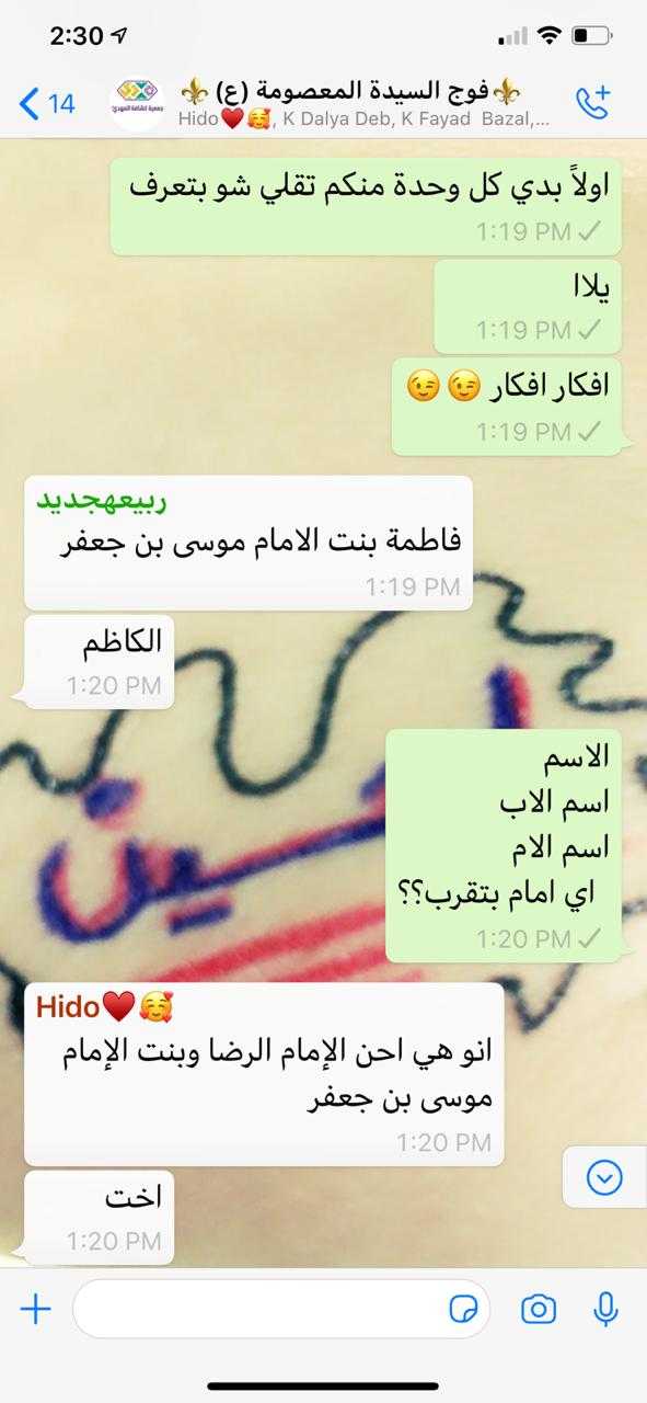أقام فوج السيدة المعصومة/ حوش السيد علي/ قطاع الهرمل نشاطه الاسبوعي في اجواء ولادة السيدة المعصومة عليها السلام، فبعد الافتتاح الرسمي تنوعت الفقرات فتعرفت الكشفيات على هوية ا لسيدة المعصومة عليها السلام، ومن ثم نبذة مختصرة عن حياتها قرابتها من المعصوم بالإضافة تقديم لمقامها الشريف مجموعة من الاعمال المستحبة كقراءة الزيارة وصلاة ركعتين صلوات على محمد وآل محمد، تسبيحات وختامها دعاء الحجة بمشاركة 35 كشفية.
