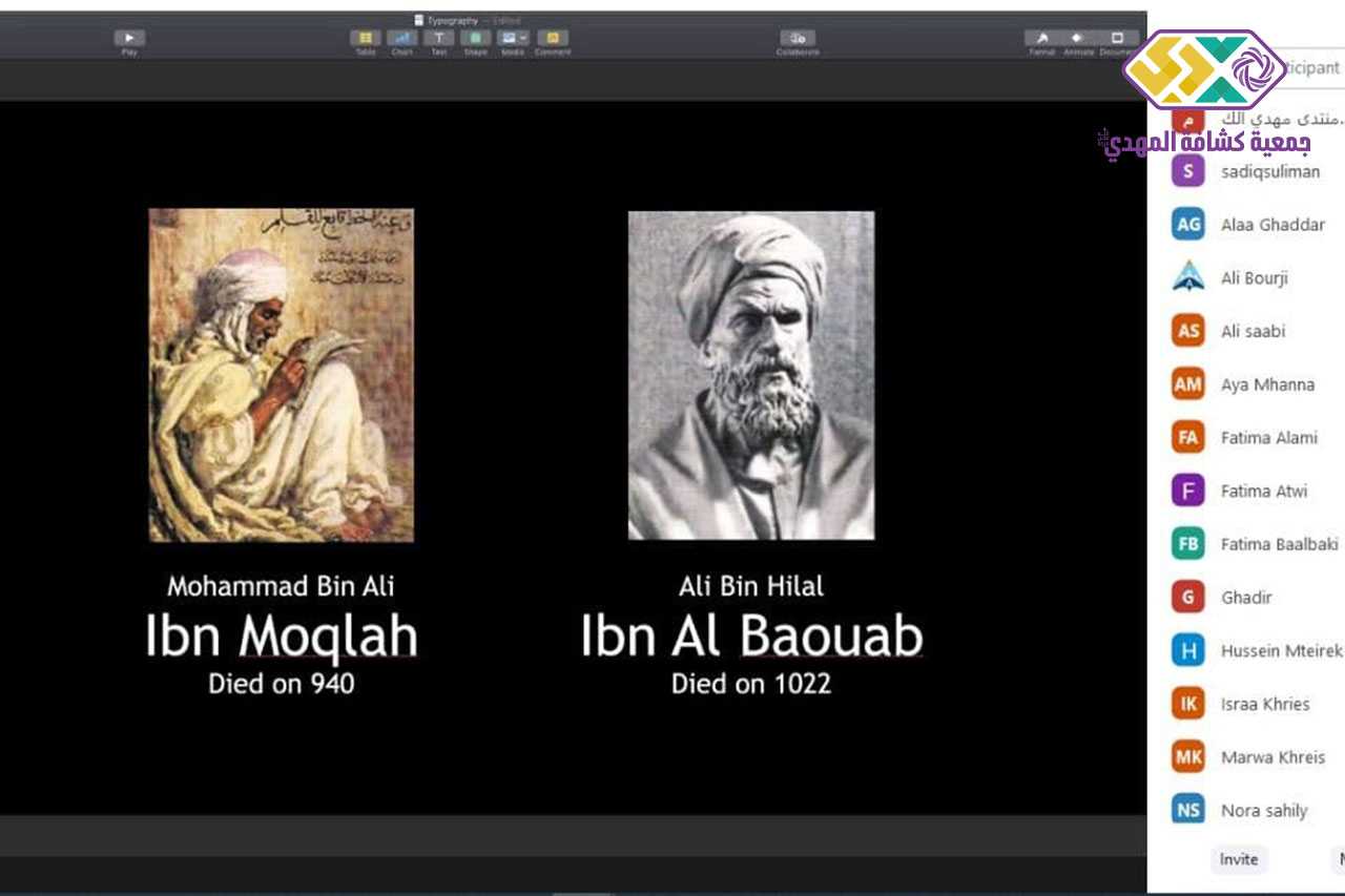 حيثُ قدّمها الأُستاذ الخطّاط "صادق سليمان" ودارَت محاوِرُها حولَ أنواع الخطوط العربيّة والأجنبيّة وتناسُق استخدامِها في مجالاتِ التّصميم وأفضل القواعد للإنخراط في عالم التّخطيط بأسلوبٍ من الأدب والإبداع مع عرض التّطبيقات وتنفيذِ المخطوطات الرّقميّة بوسائلَ تِقنيّة وطرُق مُتعدِّدة.