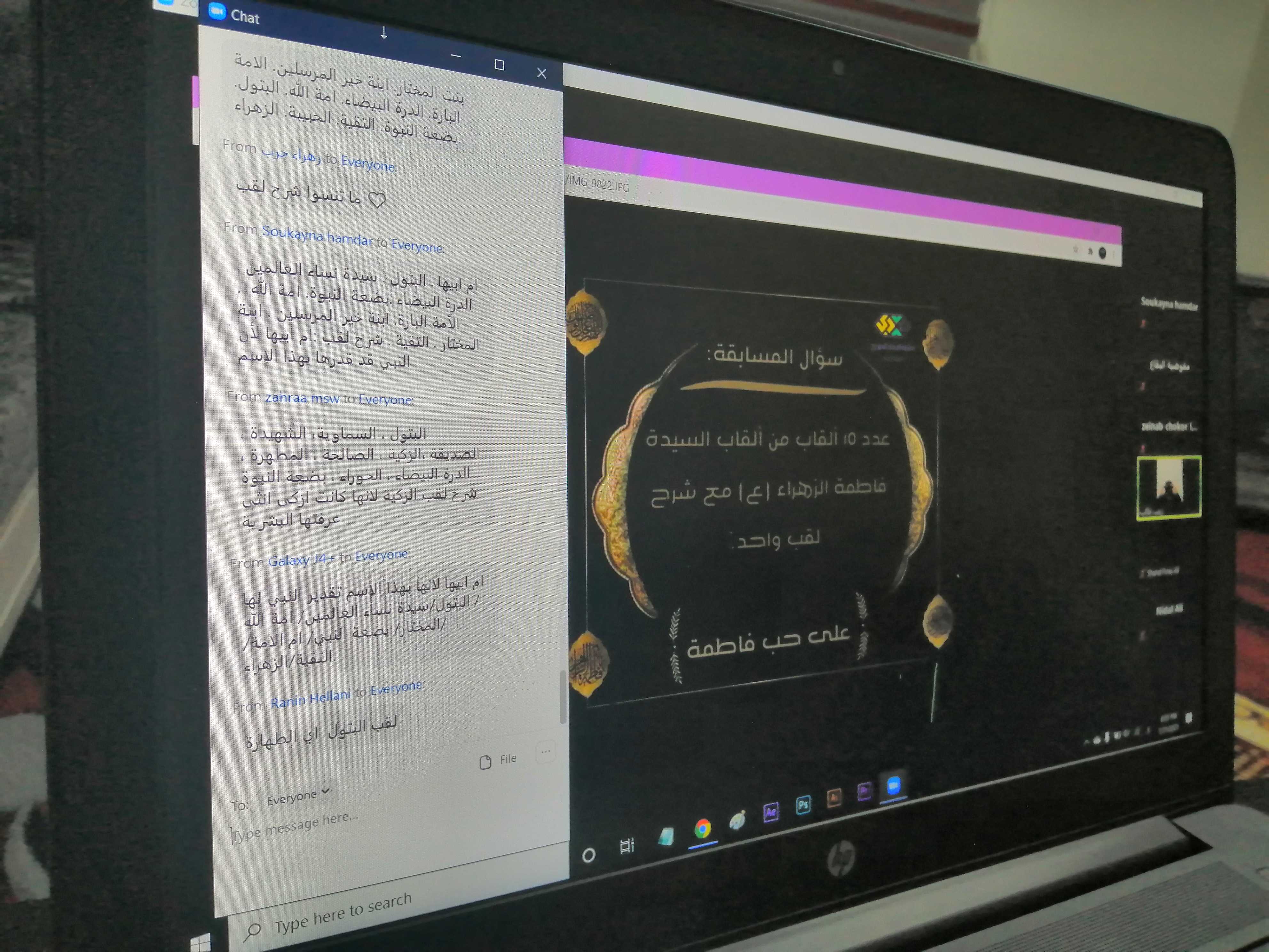 واست دليلات القطاع الشرقي السيدة الزهراء عليها السلام، فإجتمعن على حبها في لقاء إلكتروني عبر تطبيق الزووم، وبعد القرآن اطلقت المسابقة من وحي المناسبة و بعدها ذرفت الدموع حزنا على المصاب في مجلس العزاء الفاطمي والختام بلطمية واعلان اسم الفائزة.