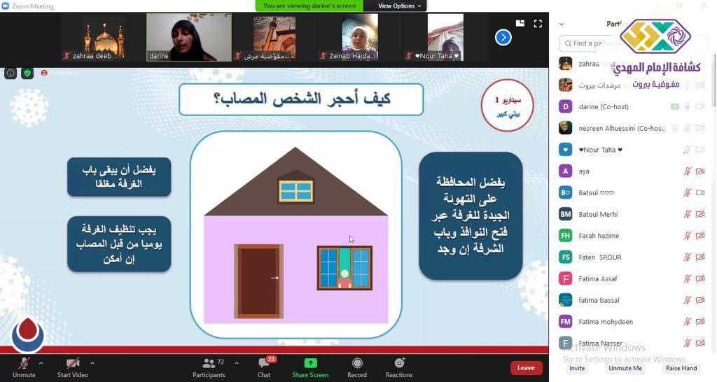 لأن في صحتها تتعزز صحة مجتمع بأكمله استهدفت مفوضية المرشدات في بيروت وبالتعاون مع الهيئة الصحية الاسلامية أكثر من ١٠٠ ام وقائدة بورشة تحت عنوان \"الوقاية من كورونا\" عبر برنامج الZoom