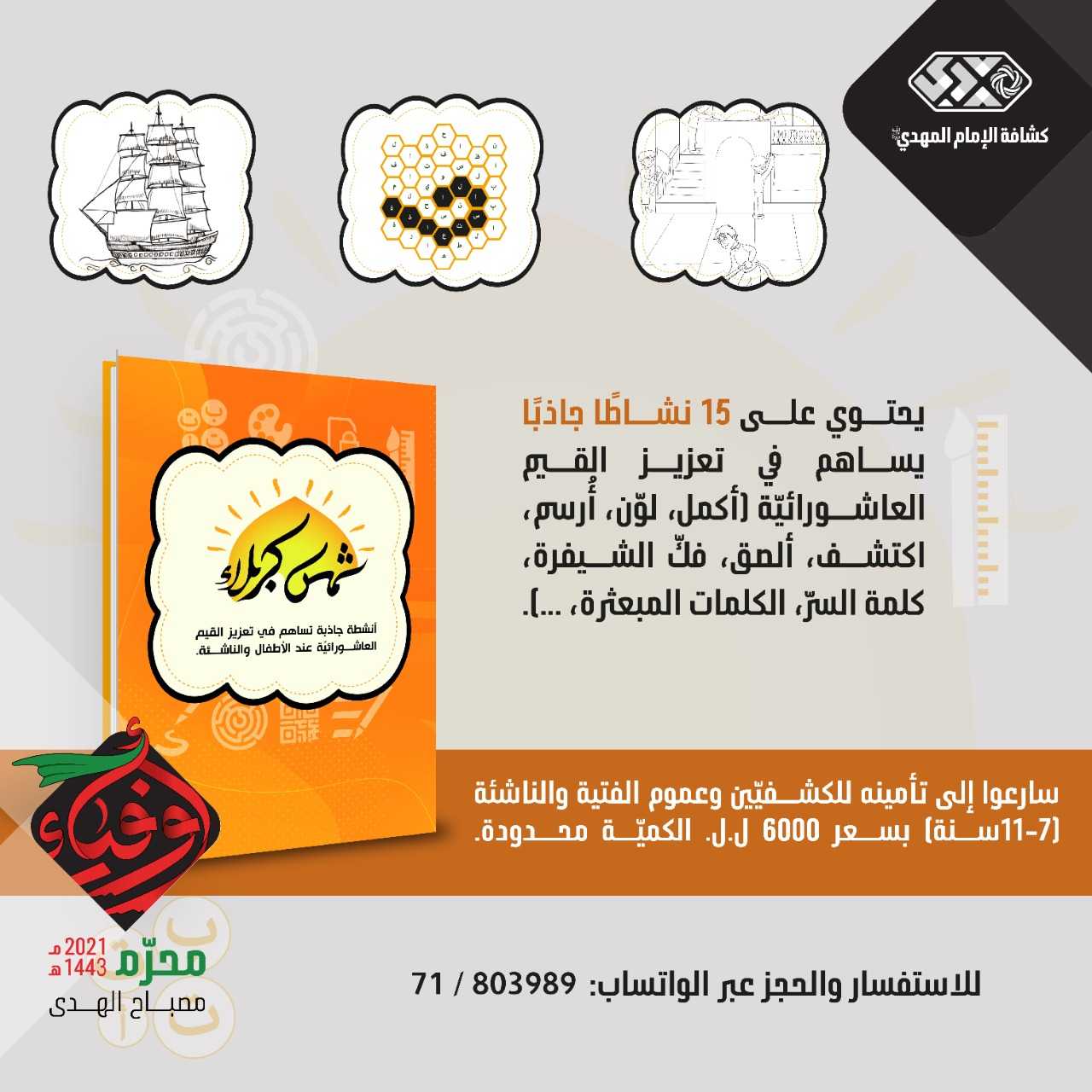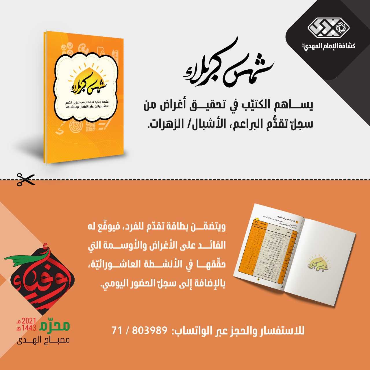شمس كربلاء هو كتيّبٌ عاشورائي يحتوي على ١٥ نشاط جاذب، ويساهم في تعزيز القيم العاشورائيّة عند الأطفال والناشئة (طلب العلم، الولاية، الجهاد، المسجد، القرآن الكريم، قضاء الحوائج، ذكر الله تعالى...) بالاعتماد على الأشكال المحببة لديهم (أرسم، ألون، أكمل، أكتشف، ألصق، فكّ الشيفرة، كلمة السر،...). يستهدف الأطفال والناشئة من عمر 7 سنوات حتى 11 سنة.