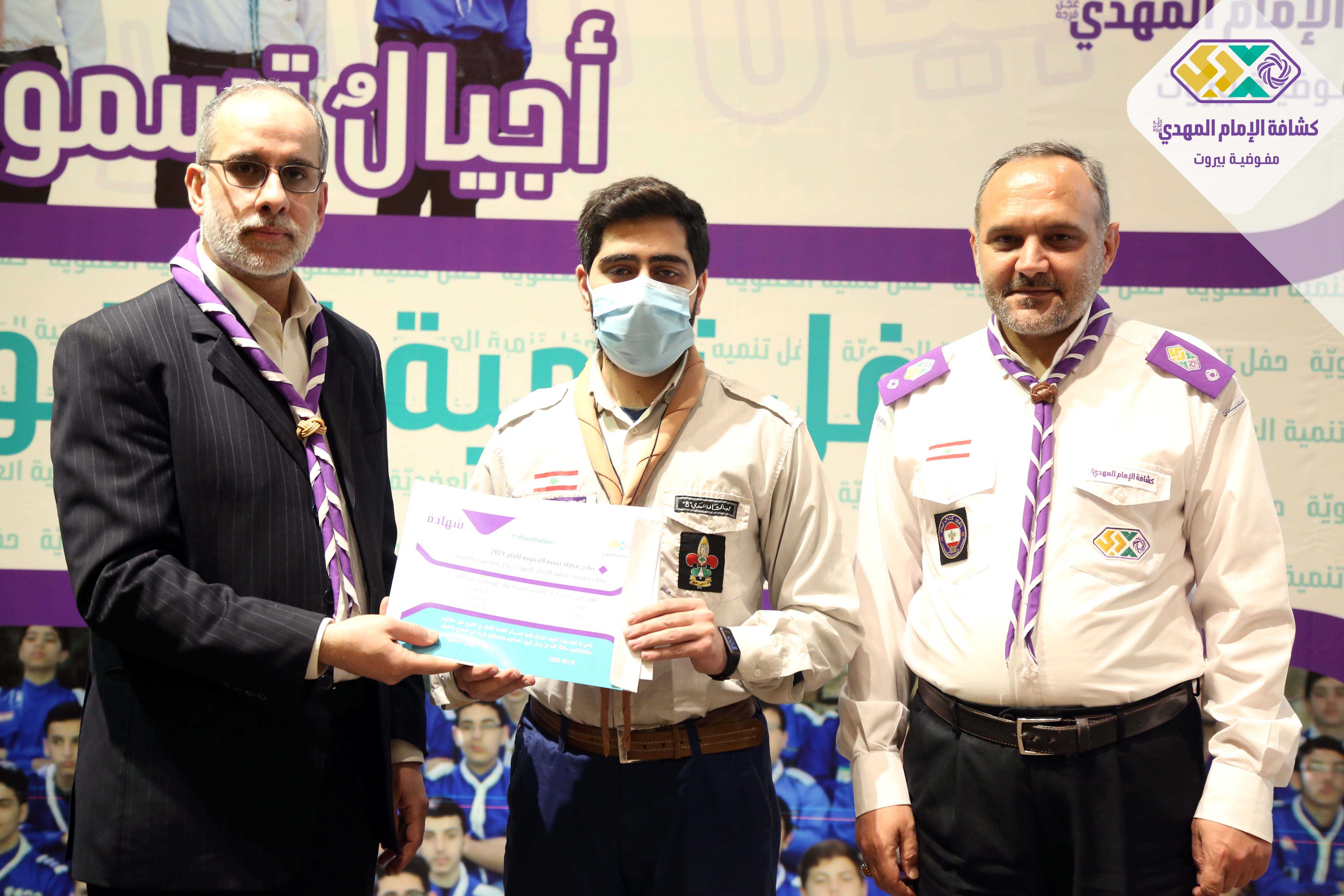 برعاية وحضور مسؤول منطقة بيروت السيد حسين فضل الله أقامت مفوضية بيروت في كشافة الامام المهدي(عج) حفل تنمية العضوية لعام ٢٠٢١ في مسرح مجمع السيدة زينب (ع) ، استهل الحفل بتلاوة عطرة للقرآن الكريم وأداء النشيدين وعرض لتقرير مصور حول أنشطة الجوالة وكلمة لمفوض بيروت الشيخ عمار جواد وبعدها كلمة راعي الحفل تضمنت تنويهاً بالجهود المبذولة وتذكيراً للقادة بضرورة الثبات والاستقامة ومؤكداً عليهم أهمية الاستقطاب كما تم التأكيد على أفواج الخدمة المجتمعية خصوصاً خلال الظروف الراهنة واختتم الحفل باعلان النتائج والحوافز على الافواج المجلية عبر توزيع شهادات التقدير لستة عشر فوج حصلوا على درجة ممتاز.