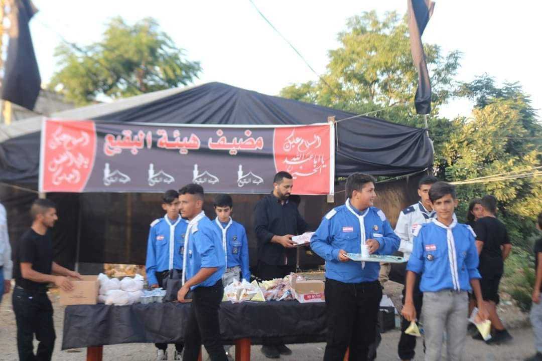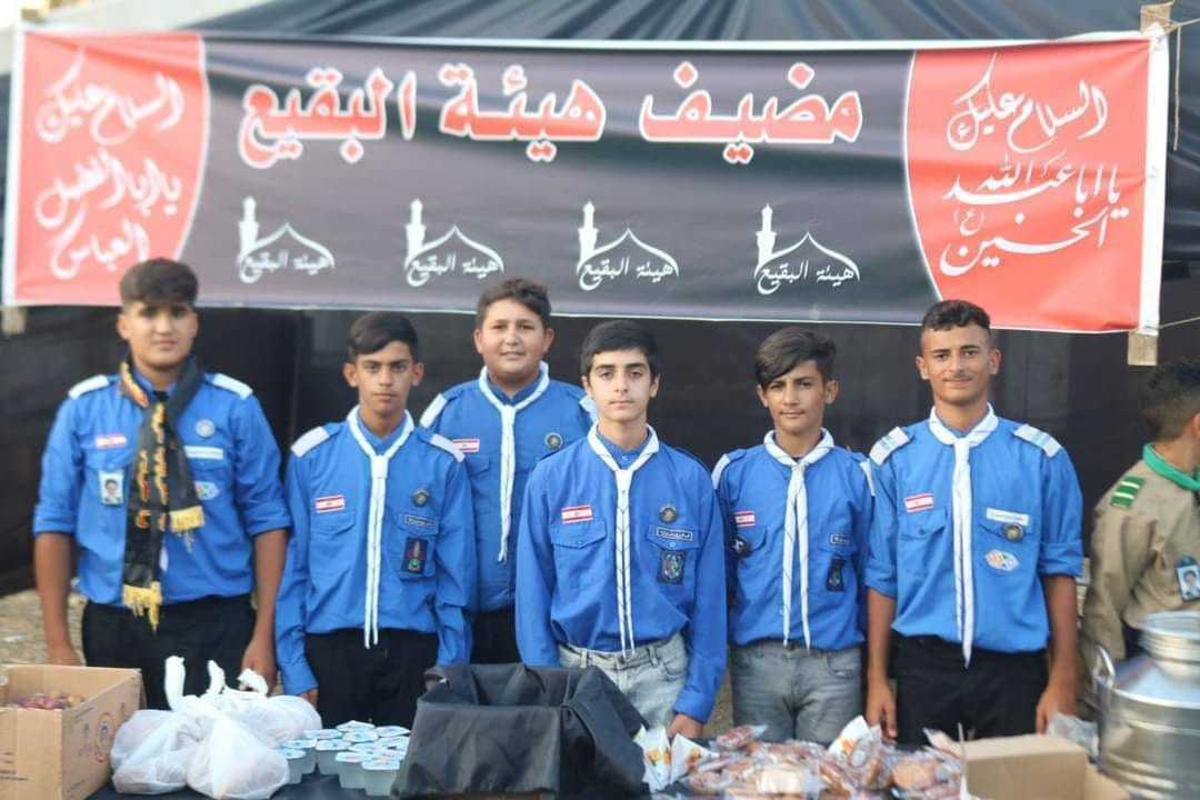 جوالة فوج الإمام الهادي (عليه السلام)/بيت ليف يشاركون في الخدمة وتوزيع الحصص الغذائية على حب الإمام الحسين (عليه السلام) في مضيف هيئة البقيع.