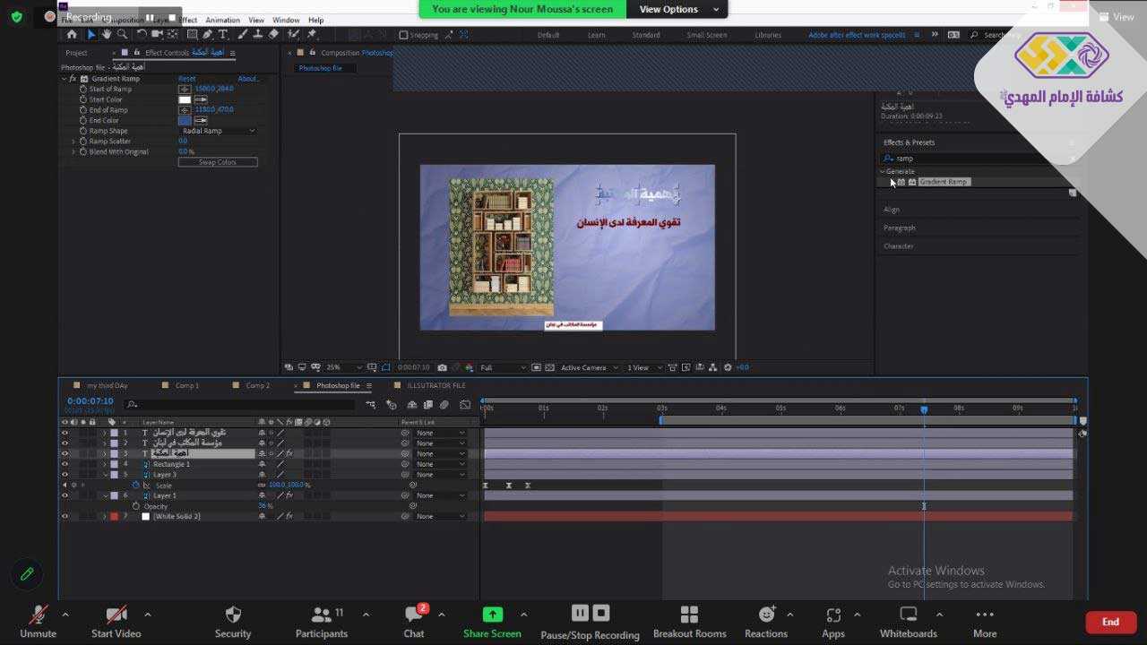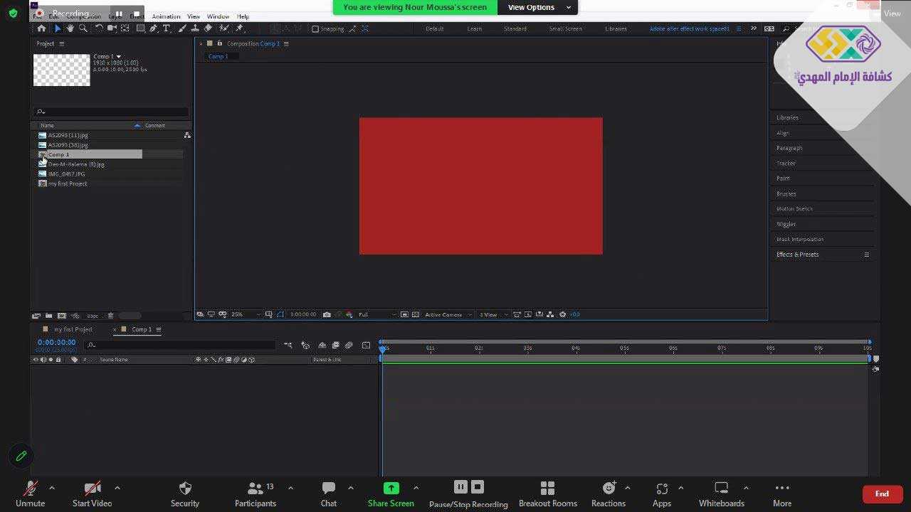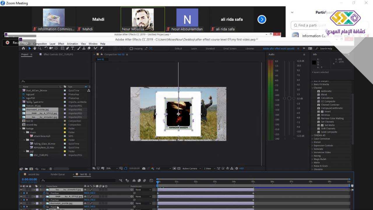 أقيمت الدورة عن بُعد عبر برنامج zoom، وخلالها تعرف المُشاركون على أساسيات برنامج adobe after effect، والواجهة الأساسية فيه، إضافةً إلى الأدوات وكيفية استخدامها وغيرها من العناوين المهمة. كما طبّق المتدربون كل المهارات التي تعلموها خلال الدورة، وشاهدوا بعض الأعمال المهمة للمدرب واستفادوا من تجربته العملية.