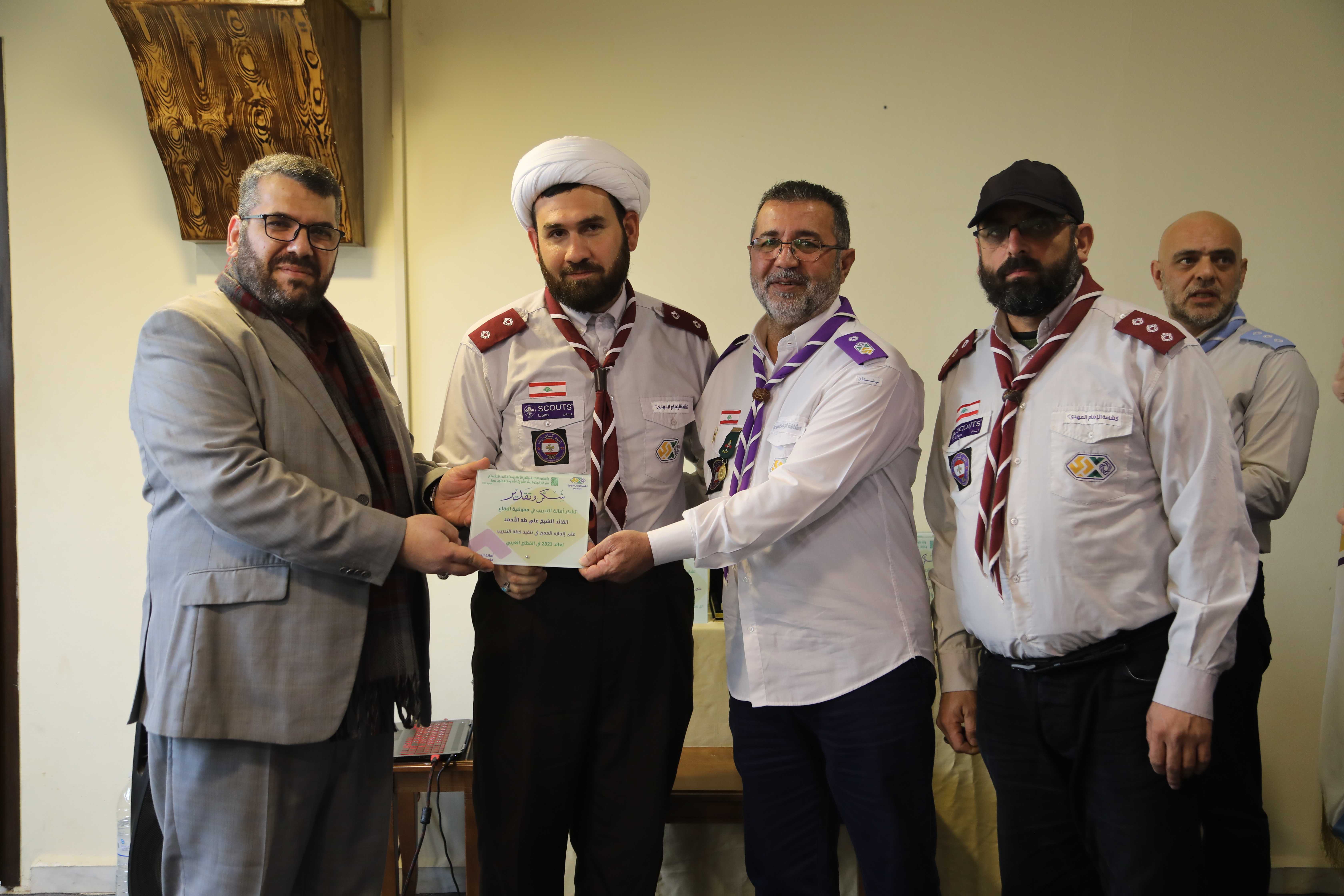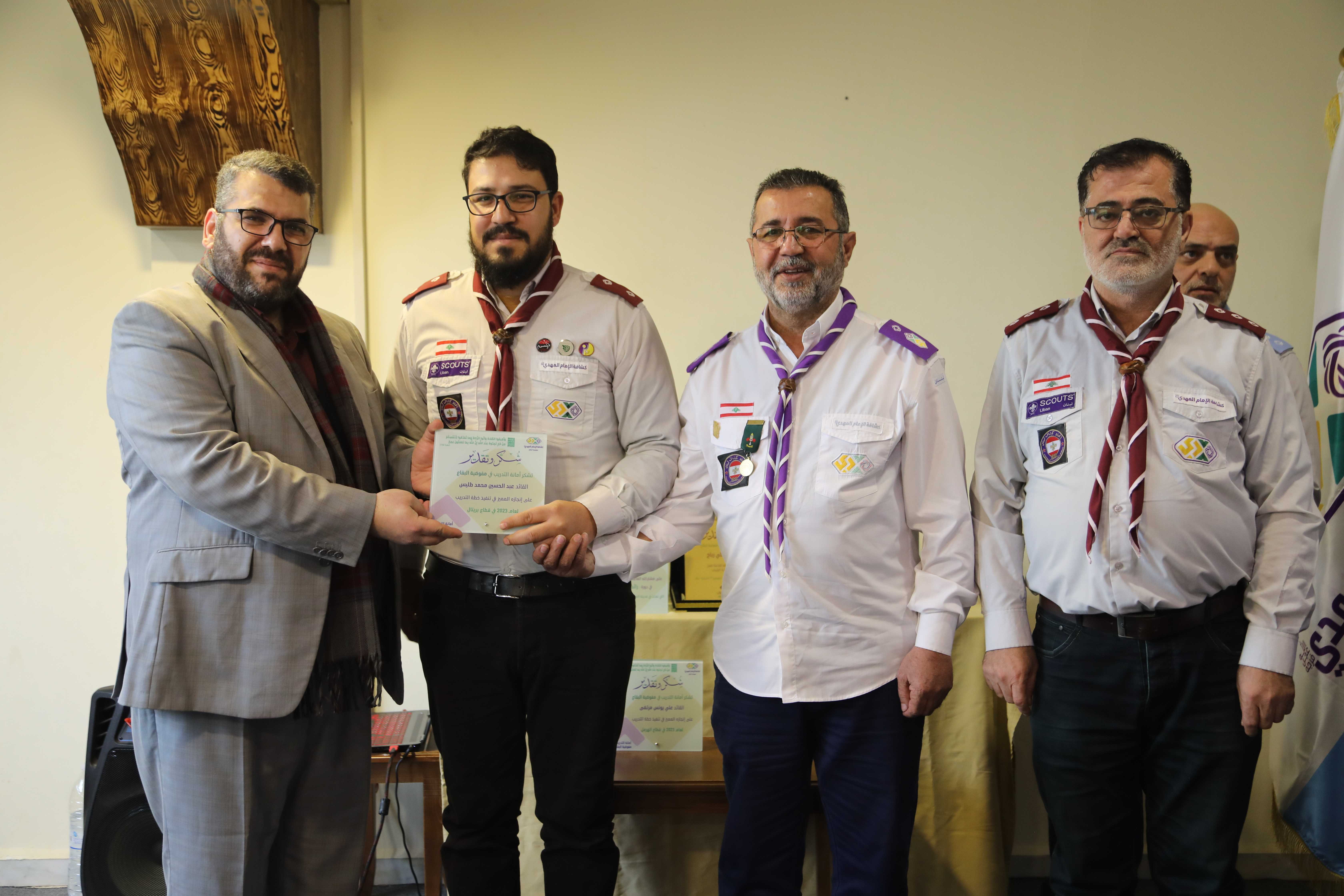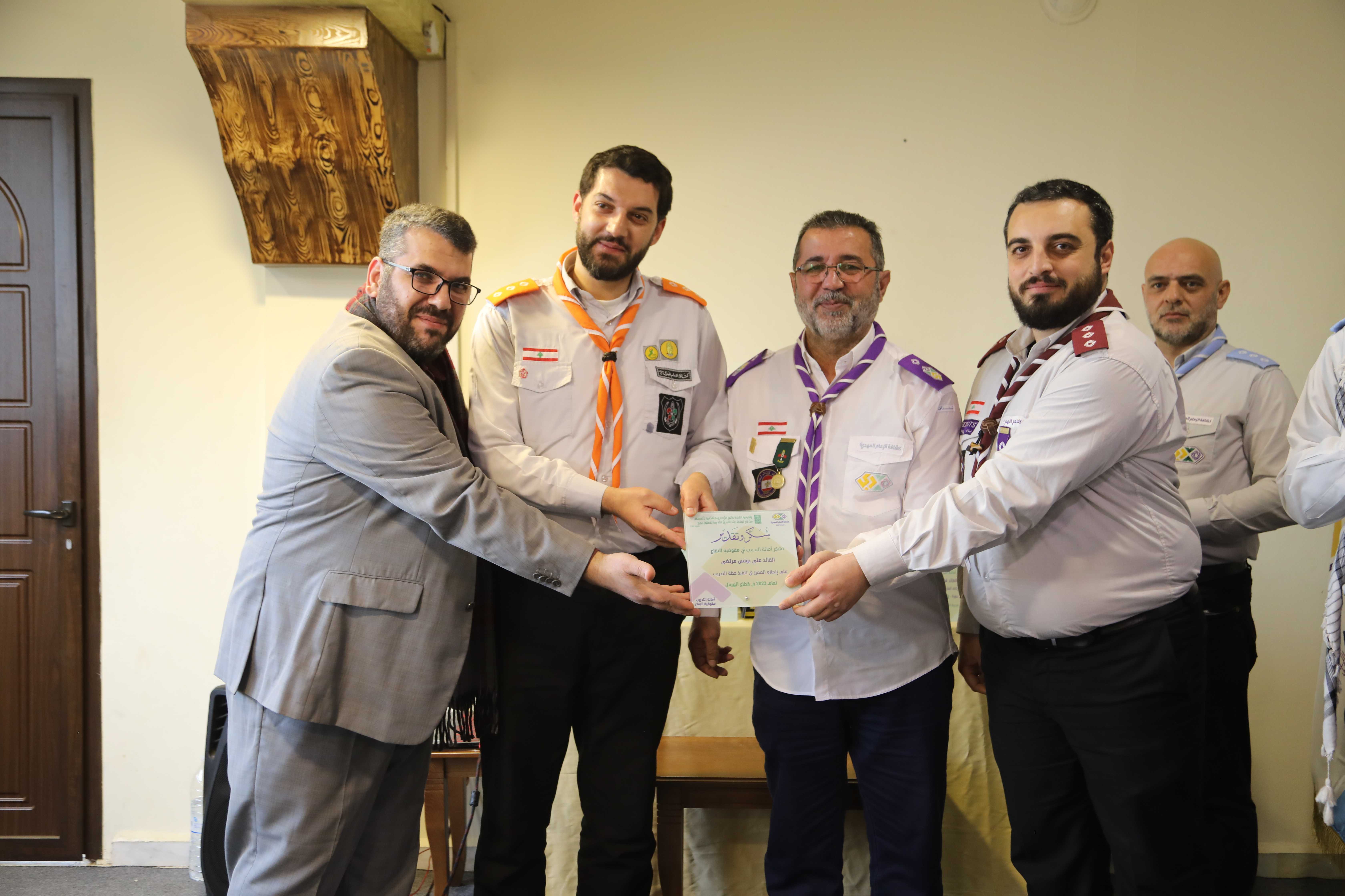 وبعدها وزعت الدروع التكريمية للمحتفى بهم، كما وسلّم مفوض البقاع درعاً تكريمياً للدكتور رباح تقديراً لجهوده ومساهمته في إنجاح التدريب في مفوضية البقاع، لينتقل الحضور بعد ذلك الى حيث الصورة التذكارية ونشيد الوداع.