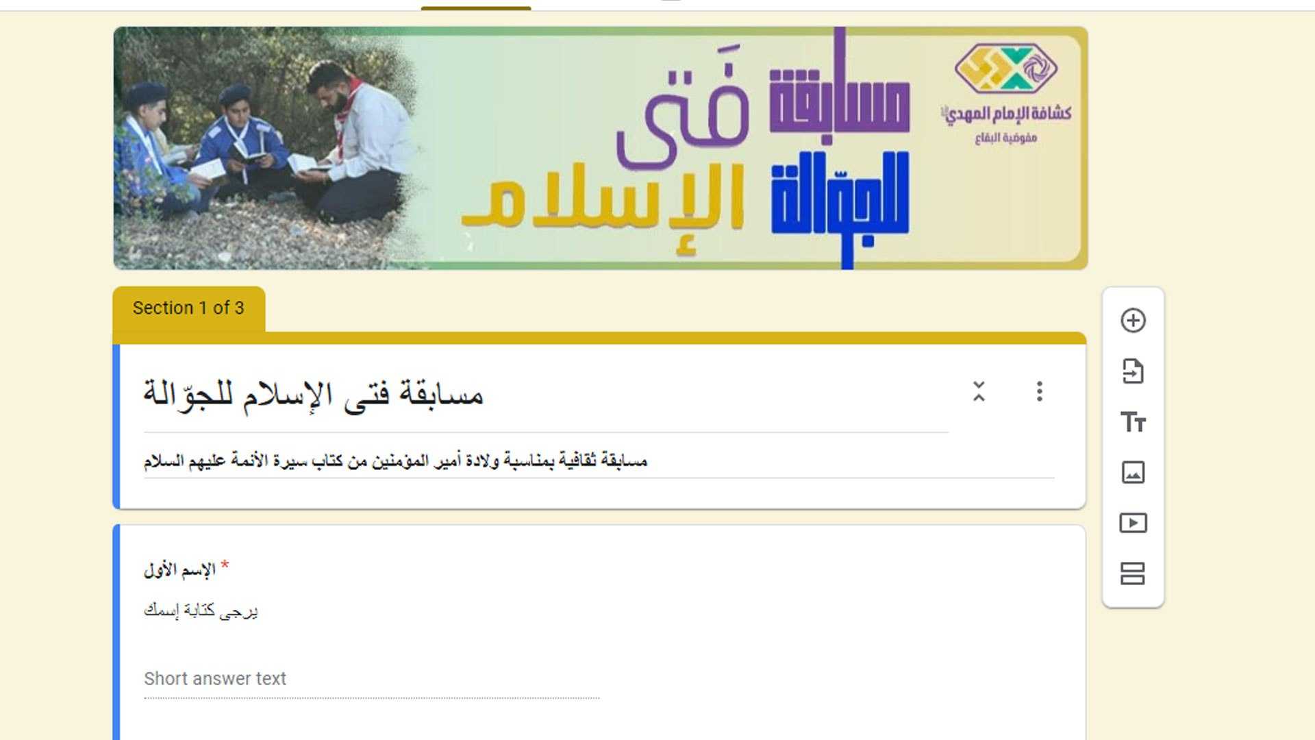 في أجواء الولادة المباركة لأمير المؤمنين علي عليه السلام , نفذت مفوضية البقاع المسابقة الالكترونية فتى الاسلام والموجهة للجوالة وقد جرت على مرحلتين , المرحلة الاولى وزع خلالها كتيب تضمن العديد من الأبواب ليصار بعدها الى تأهيل أكثر من 80 جوالا من أصل 700 شاركوا بحماس, من مختلف قطاعات المفوضية ووزعت الجوائز على الفائزين بالمراتب الأولى وبلغ مجموع الجوائز 15000000 ليرة لبنانية