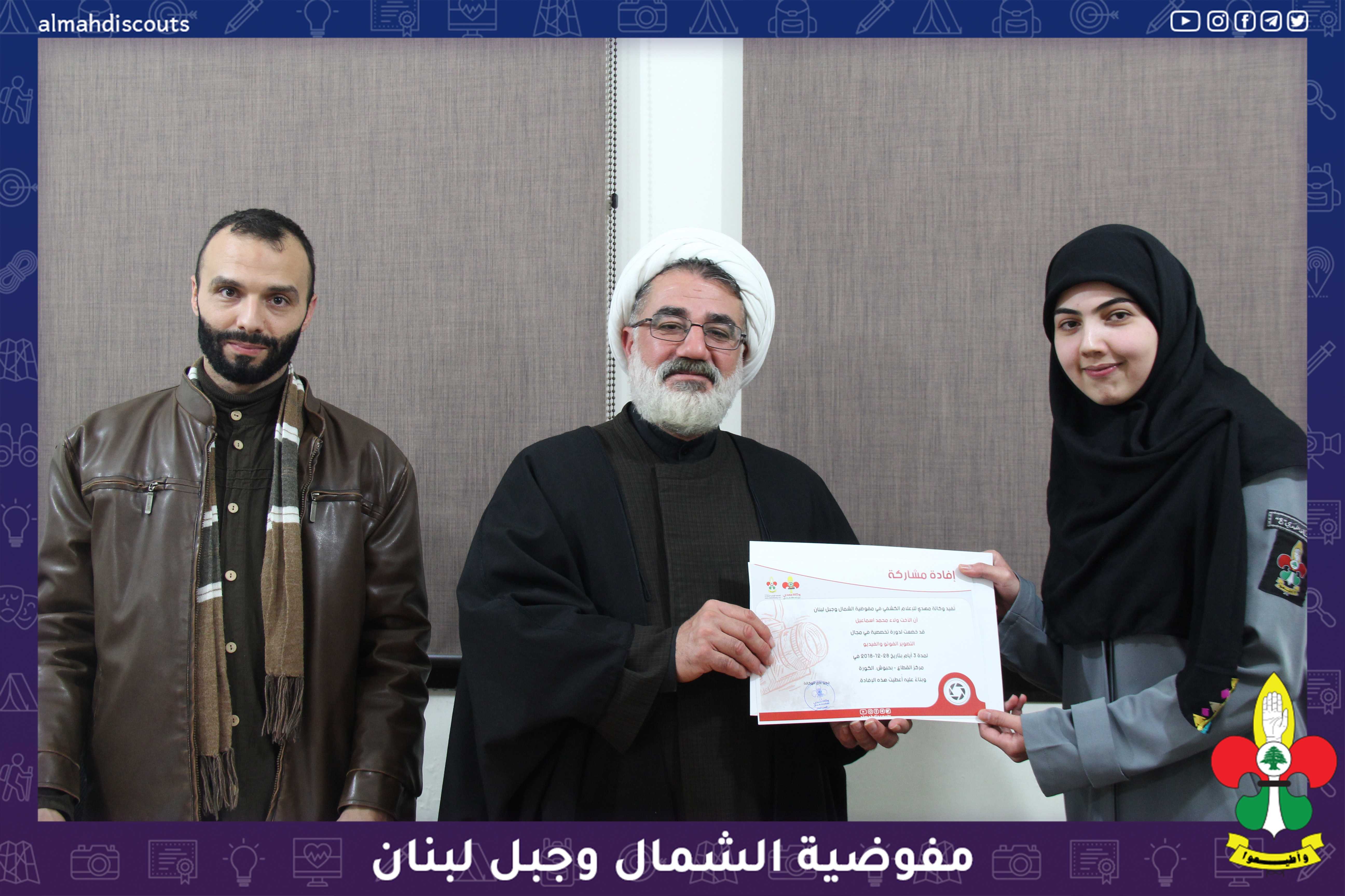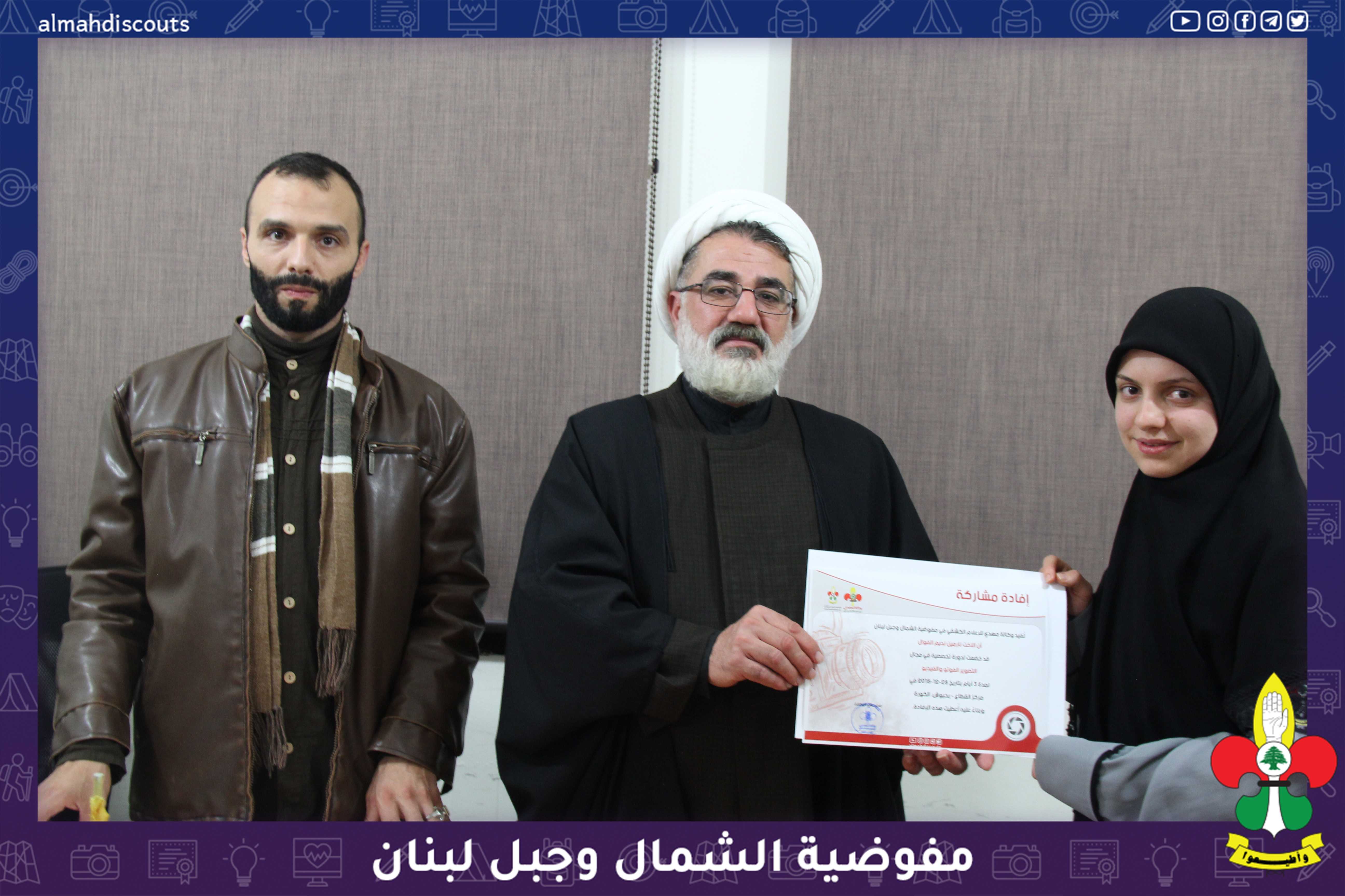 بحضور ورعاية مسؤول حزب الله في الشمال الشيخ رضا احمد اختتمت وكالة مهدي للاعلام الكشفي مفوضية الشمال وجبل لبنان دورة التصوير الفوتو والفيديو التي اقامتها في منطقة الكورة الشيخ رضا الذي تحدث عن دور الاعلام واهميته في نشر ثقافة اهل البيت عليهم السلام وختاما بتوزيع الافادات على المشاركات