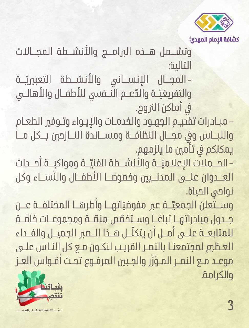 رئيس كشافة الإمام للمهدي "عجل الله فرجه" القائد الشيخ نزيه فياض يُطلق البرامج والأنشطة والمبادرات الخاصة بدعم أهلنا النازحين الى كافة مناطق النزوح ضمن مشروع "بثباتنا ننتصر".