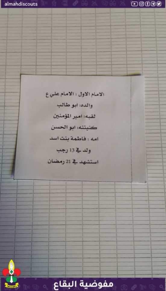 ويستكمل فوج السيدة خولة/ تمنين التحتا/ القطاع الاوسط جلساته الاسبوعية لفرقة البراعم وقد بدأ النشاط بآيات من القرآن الكريم وزيارة الامام الحسين عليه السلام، ليبدان بعدها بحفظ هوية الامام الاول الامام علي عليه السلام، وقصة البلوط، واختتم النشاط بدعاء الحجة عجل الله فرجه