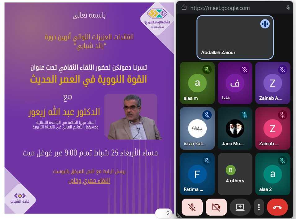 أقامت مفوضية بيروت لقاء فكري تحت عنوان "القوى النووية في العصر الحديث" مع أستاذ فيزياء الطاقة في الجامعة اللبنانية ومسؤول التعليم العالي في التعبئة التربوية الدكتور عبدالله زيعور.